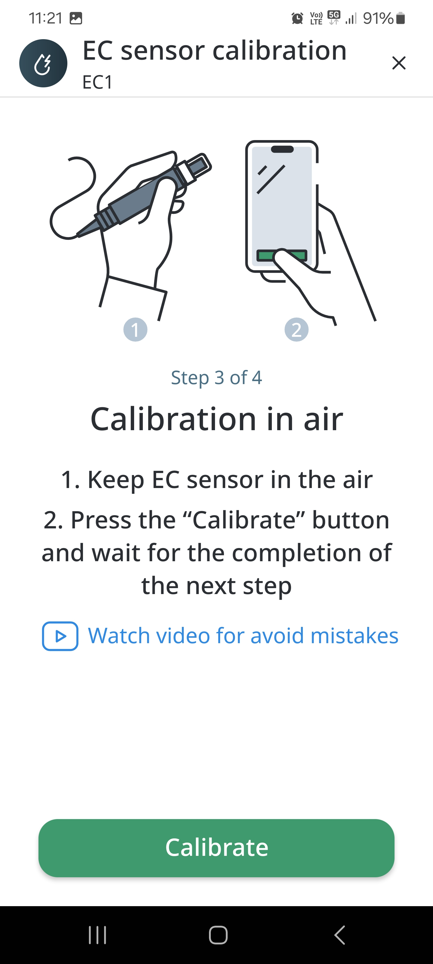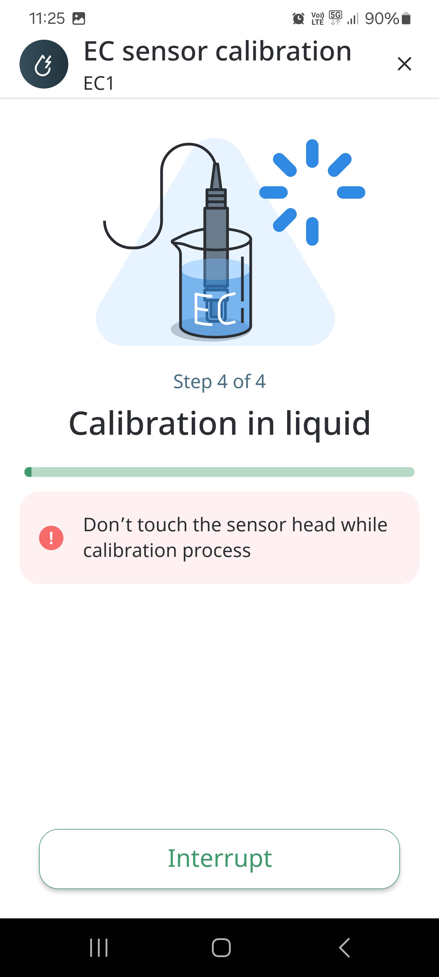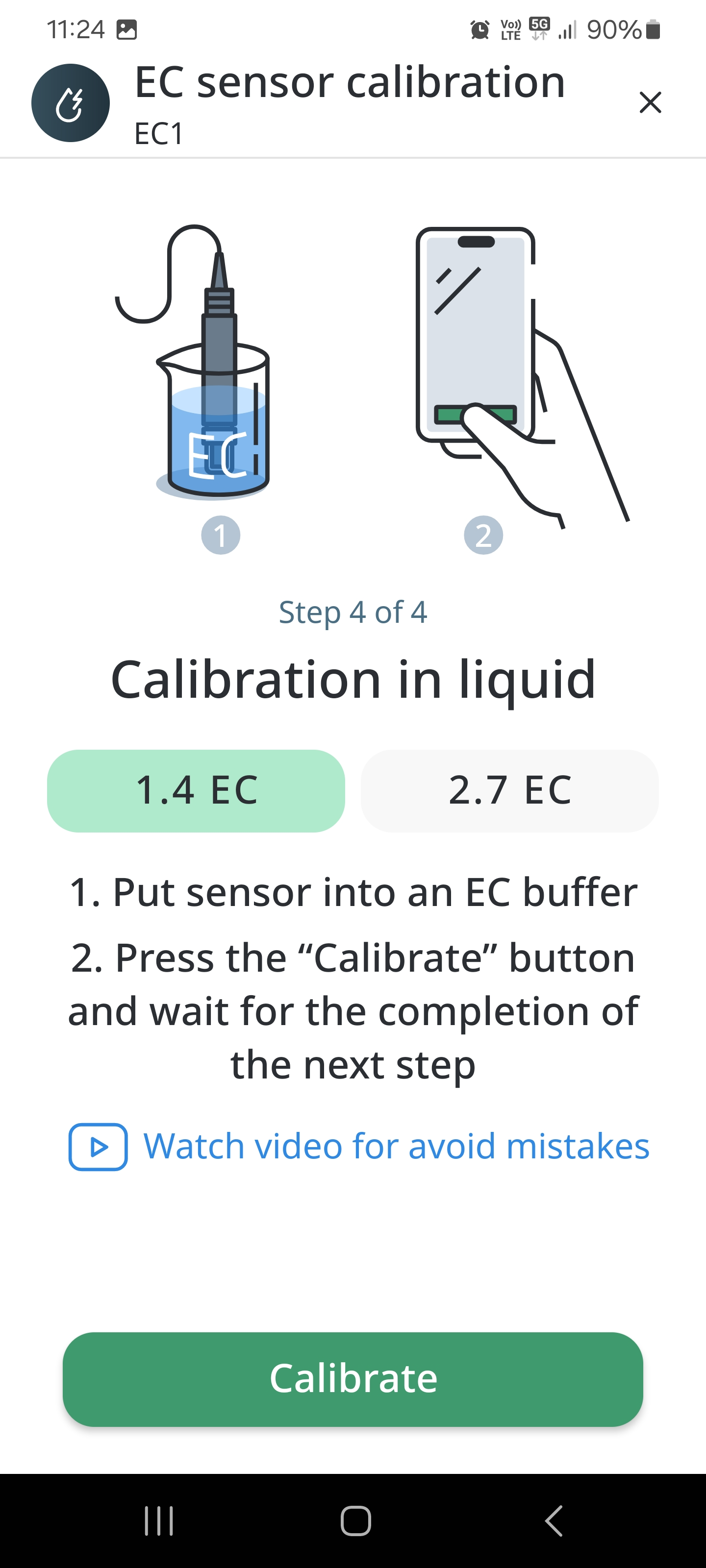 - Prepare 1.4 EC or 2.7 EC buffer and dip EC Sensor into it and tap the Calibrate EC button.