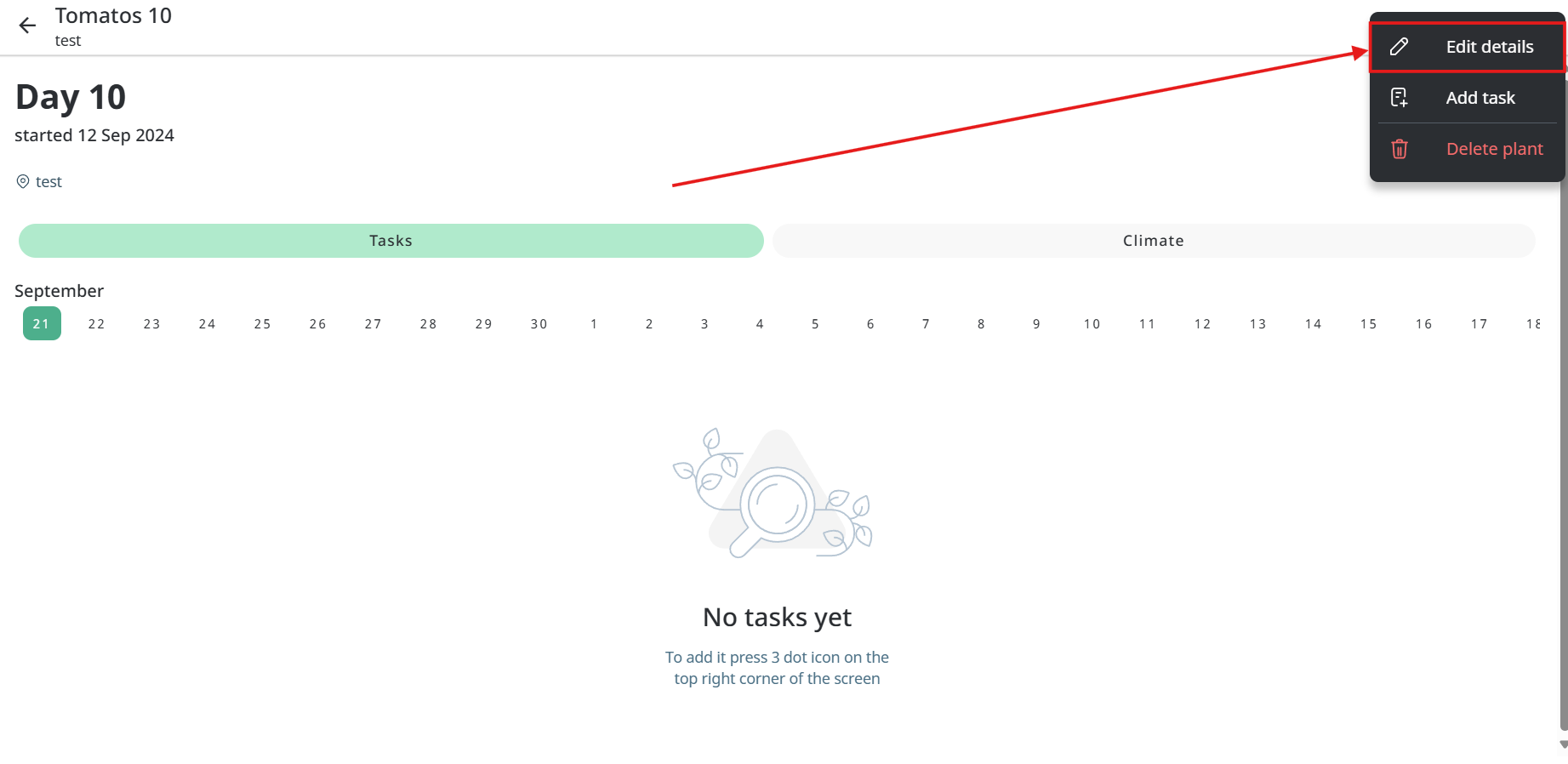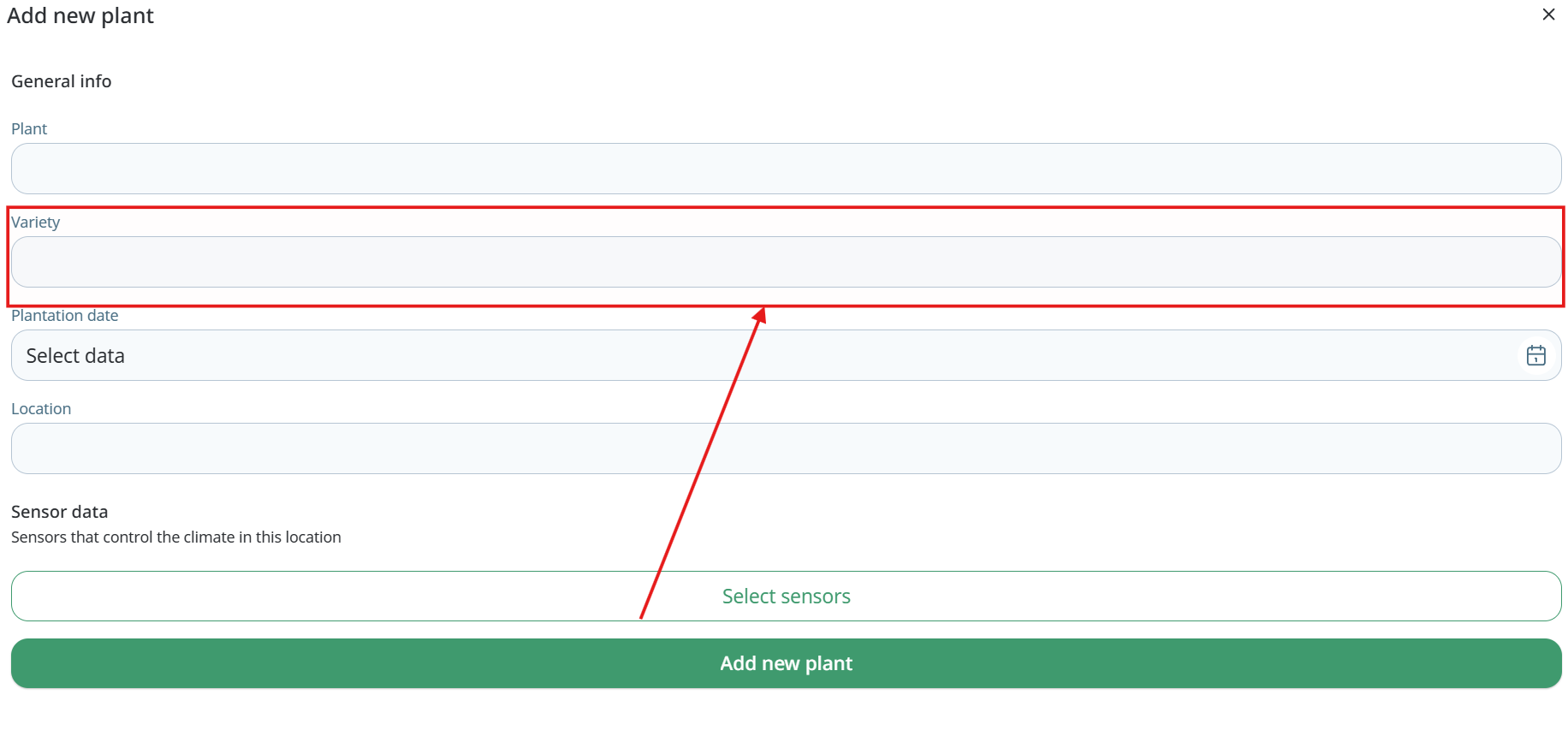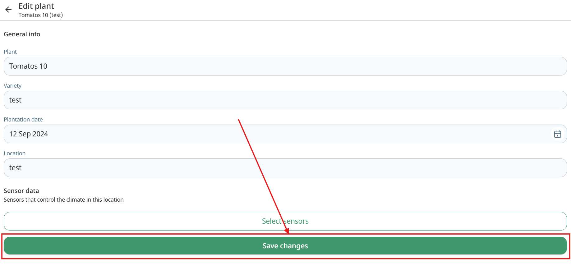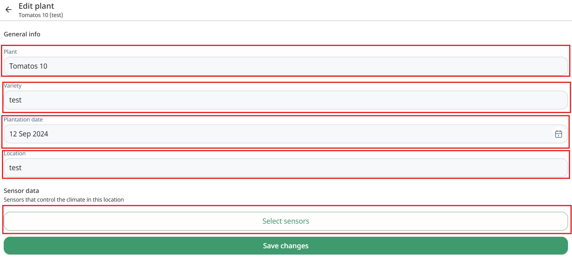 - On the opened screen users can change plant name, variety, plantation date, location and sensors.