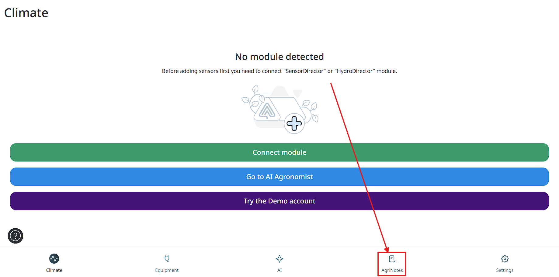 To enter Agrinotes you need to tap on the “Agrinotes” icon between “Modules” and “Settings” icons on the bottom panel of the App.