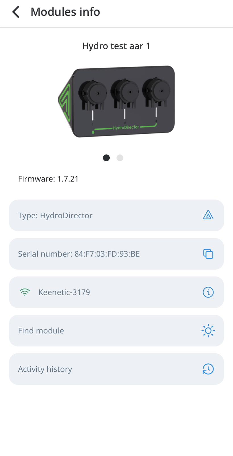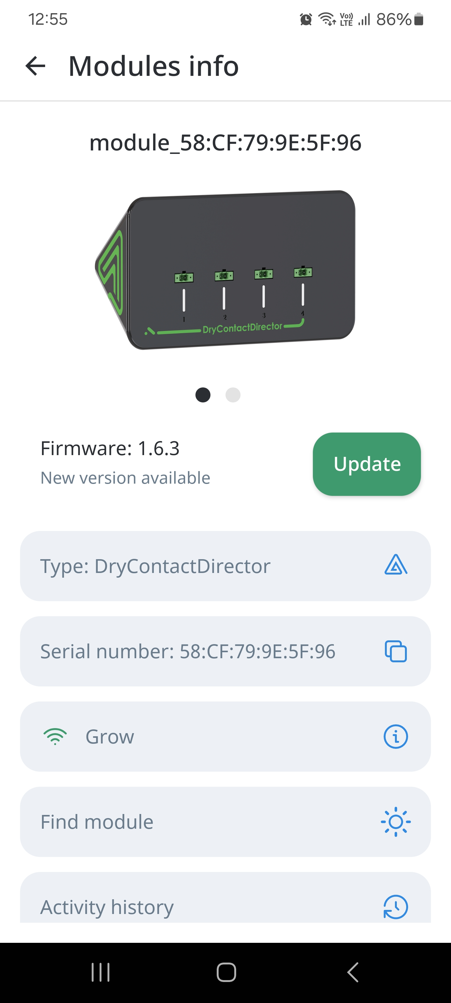 - After updating module will be automatically rebooted. Then user will see the module (in “Modules info”) updated to latest firmware.