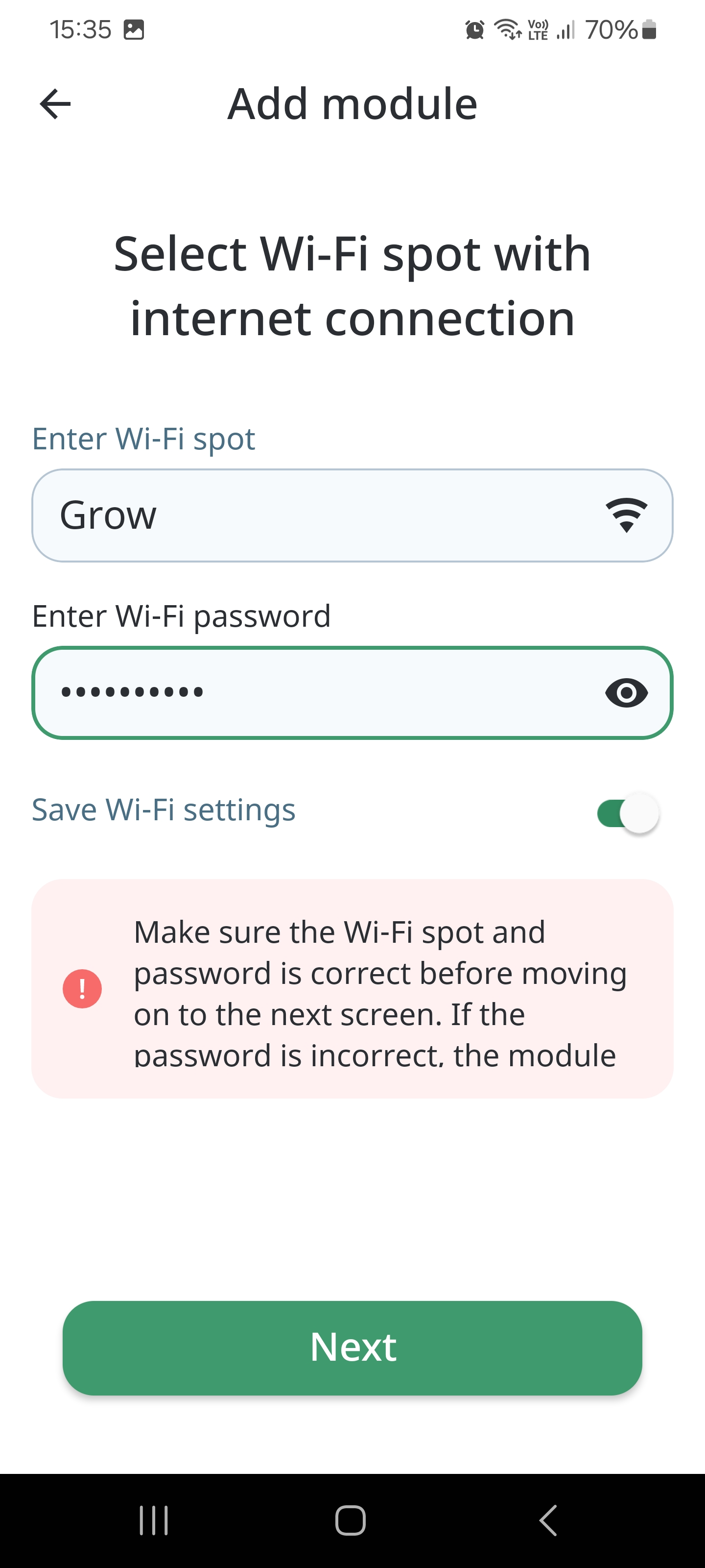 The App should automatically detect your Wi-Fi network. Verify that it matches the network you want to connect the Module to.
