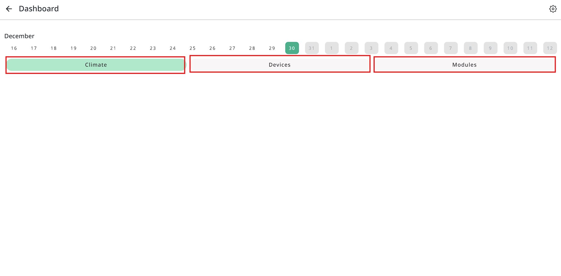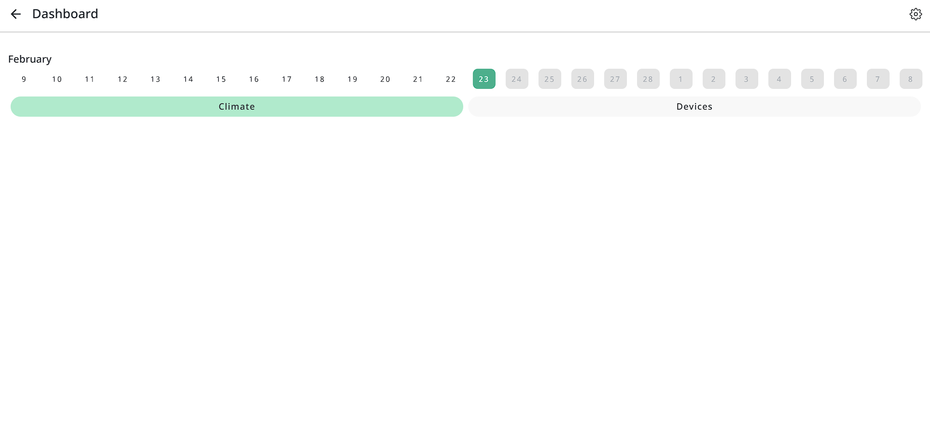- Next you need to set time when day starts and day ends, after it you will see screen with next tabs: “Climate”, “Devices” and “Modules” also you can see calendar with dates.