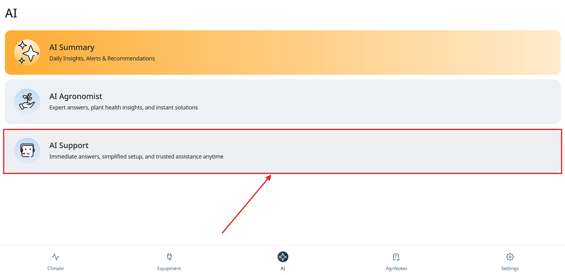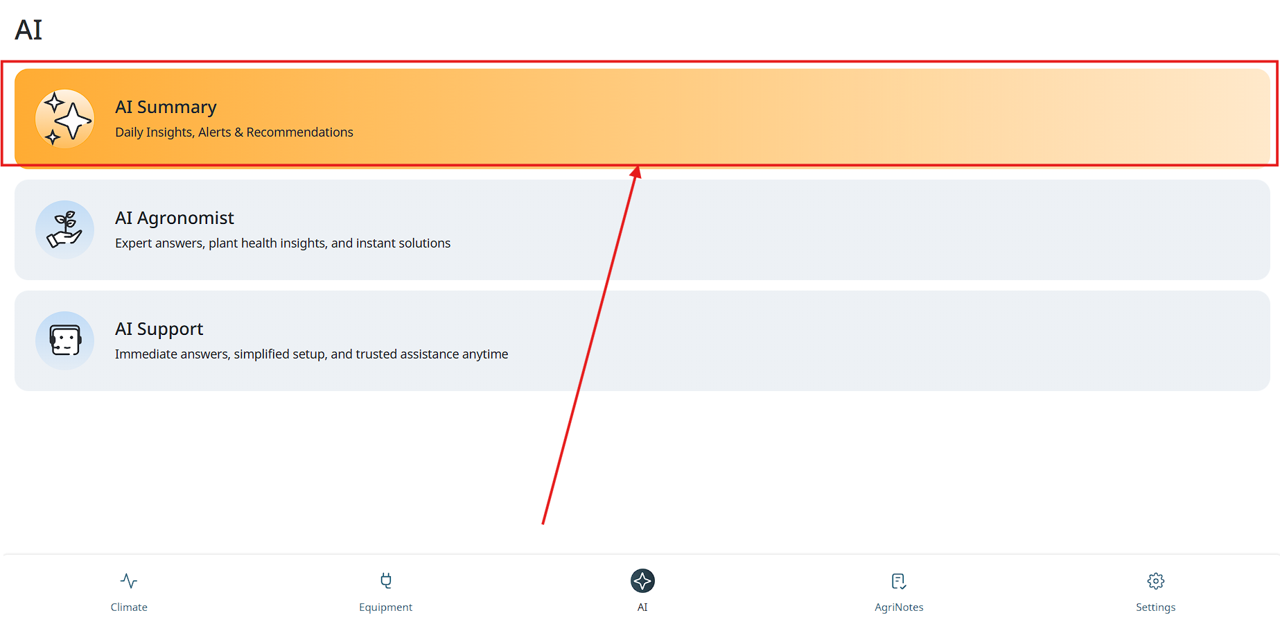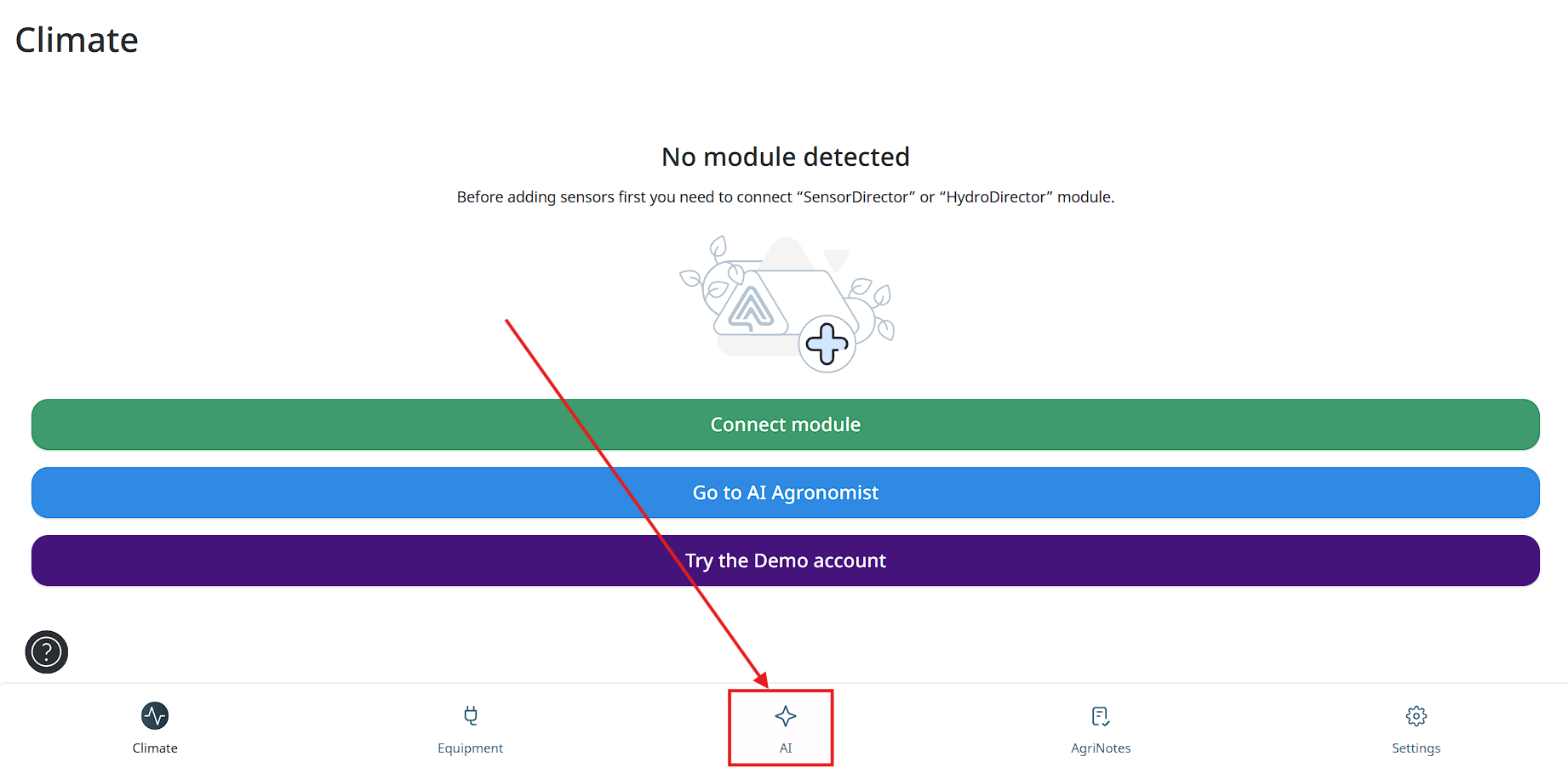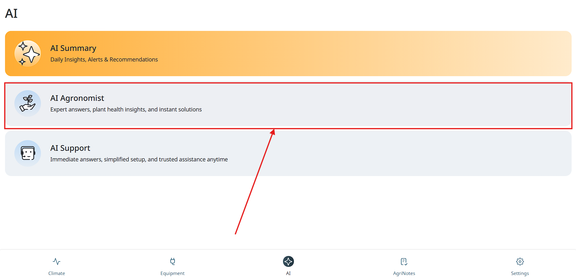 - To enter AI Agronomist user needs to tap on the “AI” button in the bottom menu on the main screen.