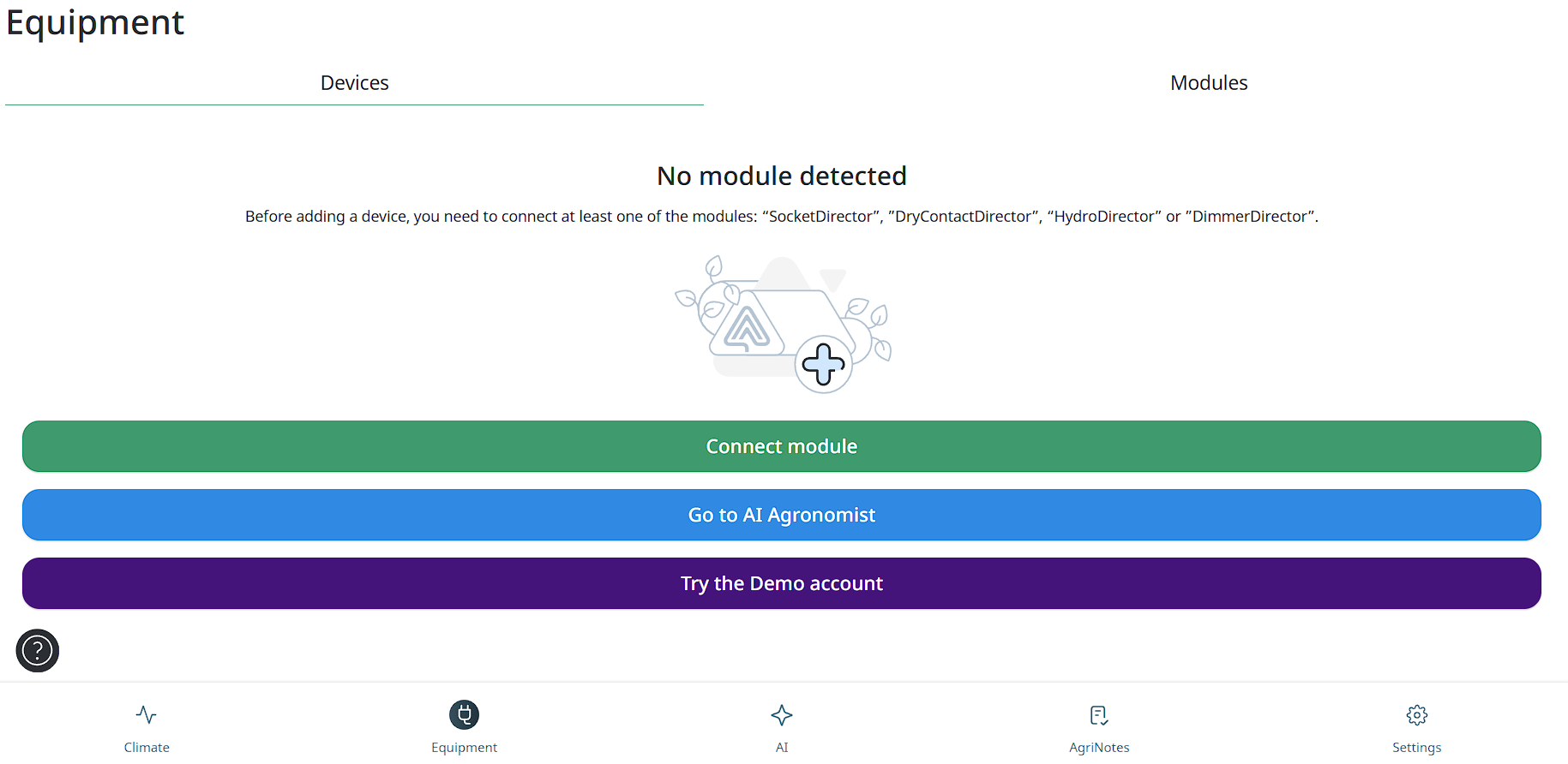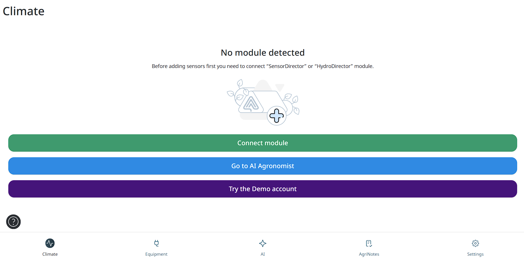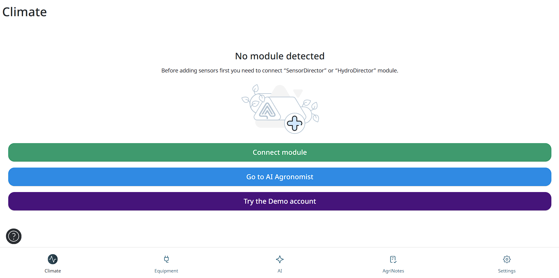 When user opens the GrowDirector App for the very first time, there are no Modules in the System yet. Therefore, user must first add (connect) the first Module to proceed.