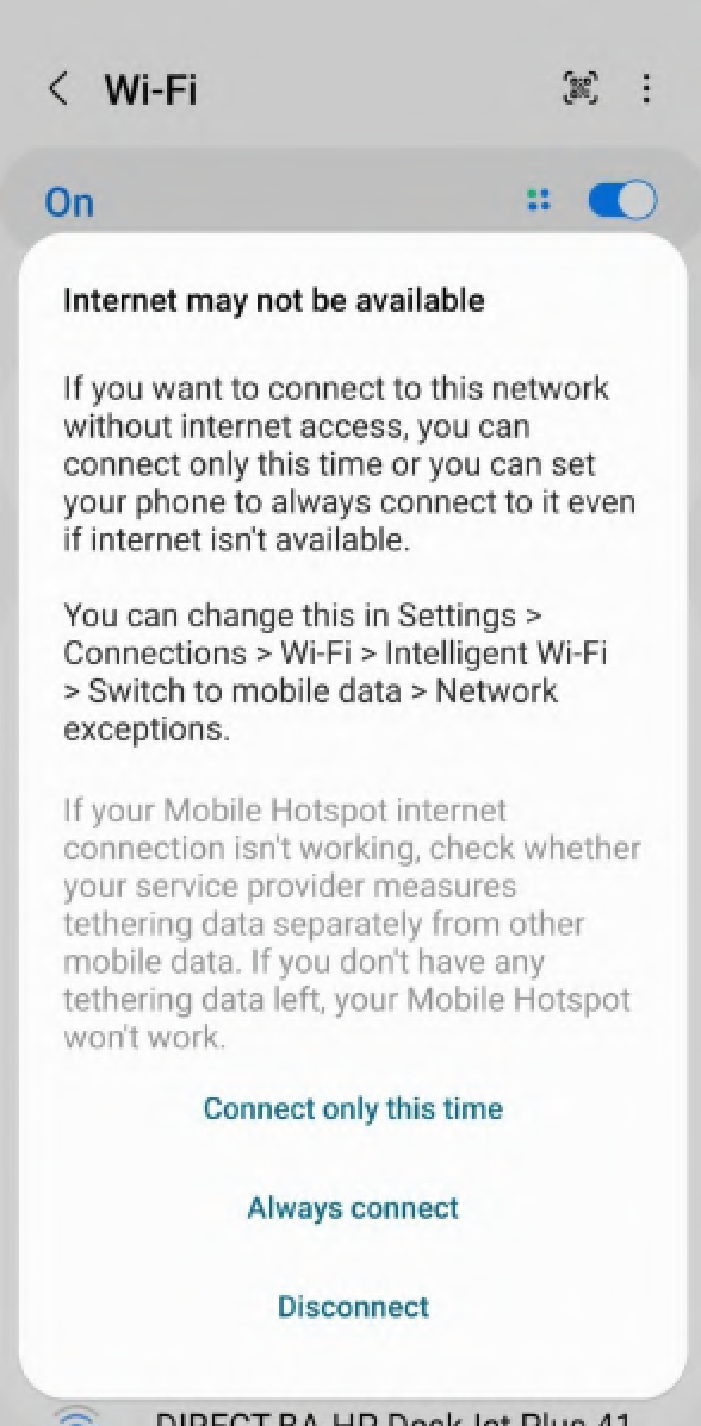 12. If a message appears stating 'Internet may not be available', select the 'Always connect' option to bypass this warning.
