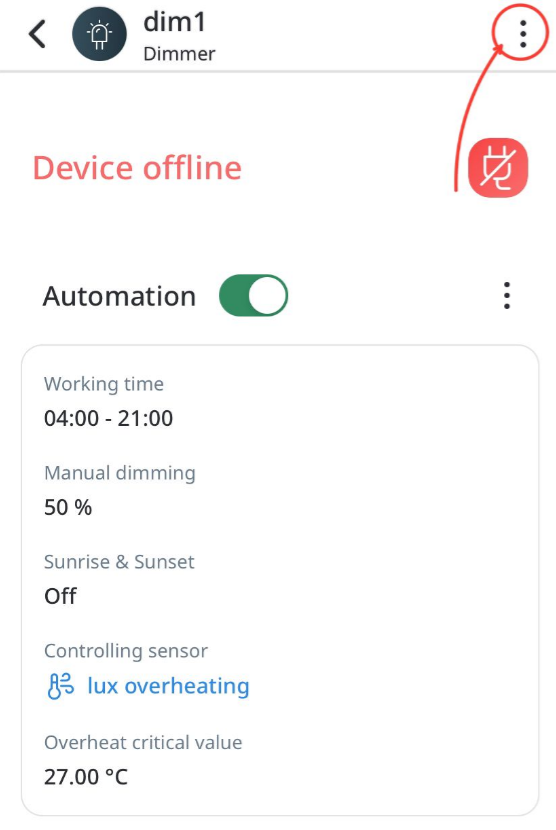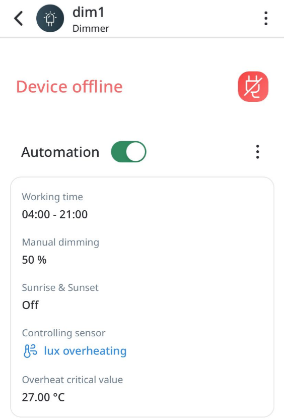 In the opened screen user will see next parameters: “working time”, “manual dimming”, “overheat prevention” and “sunset & sunrise”.