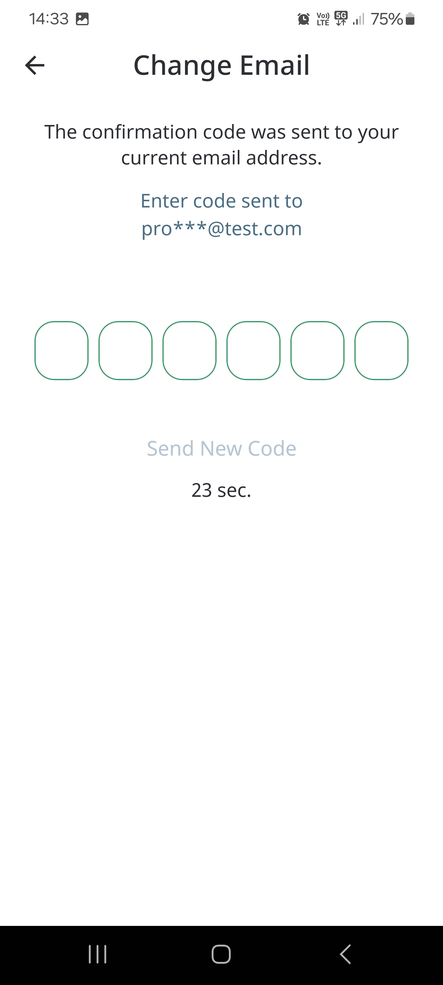 - On this mail you will get 6-numbers code to enter here. After entering the code and pressing “Ok” the system will send other 6-numbers code to the old email which you have to enter in the App too.