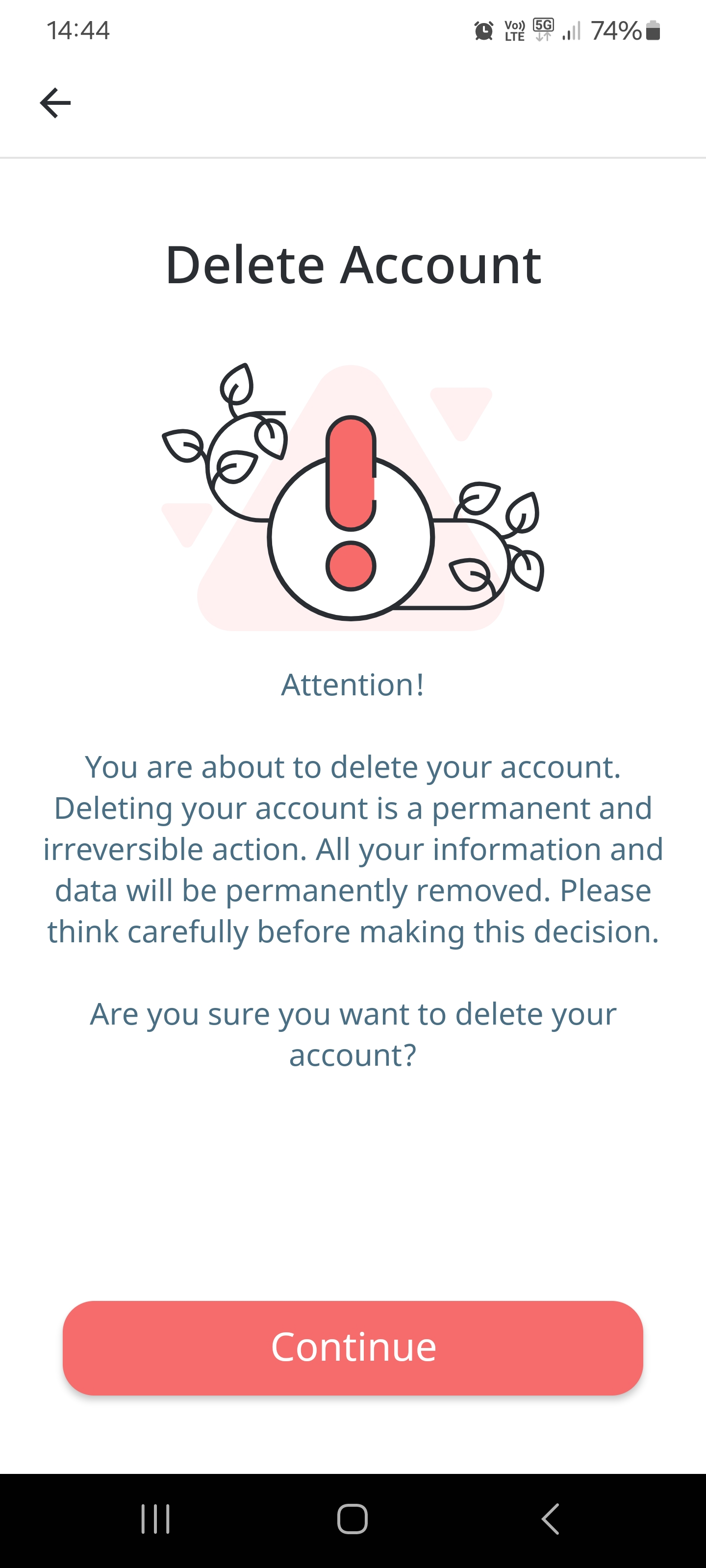 A pop-up window will appear, warning you that this is an irreversible action. Click Continue if you are sure you want to delete your account.