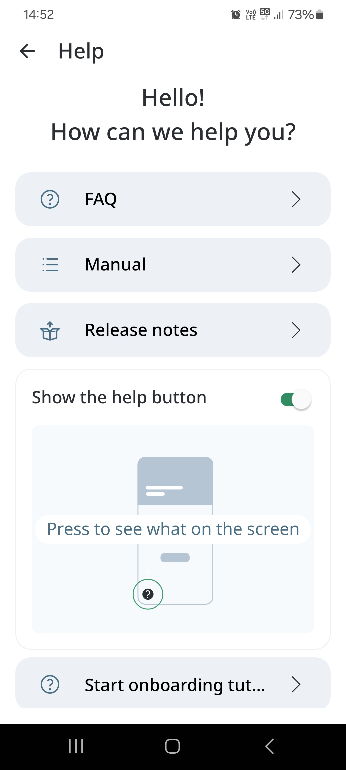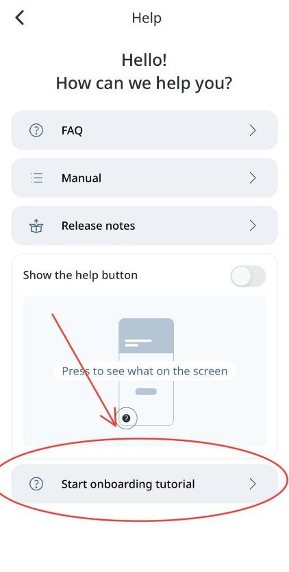- Tap the Start onboarding tutorial button. The following screen appears: