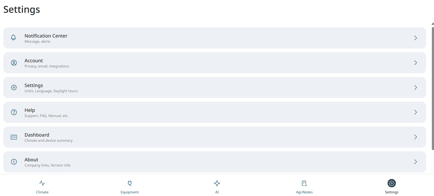 GrowDirector lets you manage your common account settings. To access the settings page, tap the Settings button on the right corner of the TabBar. The following Settings screen appears: