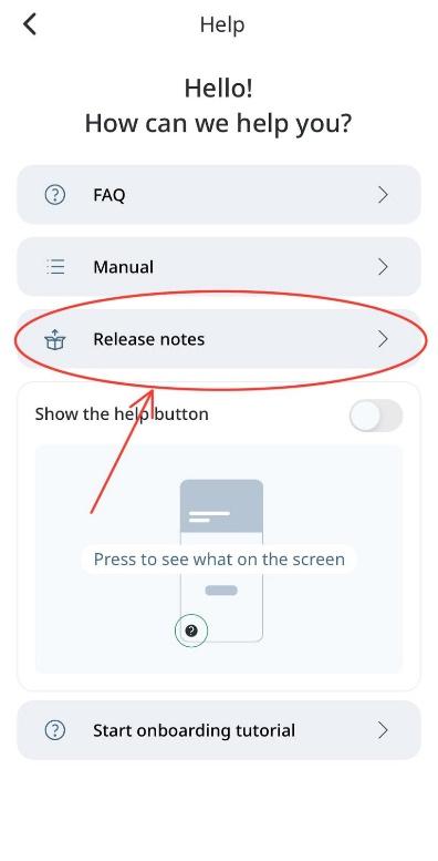 - Tap the Help option on the Settings screen, also you have an option to turn on/off the help button. The following screen appears: